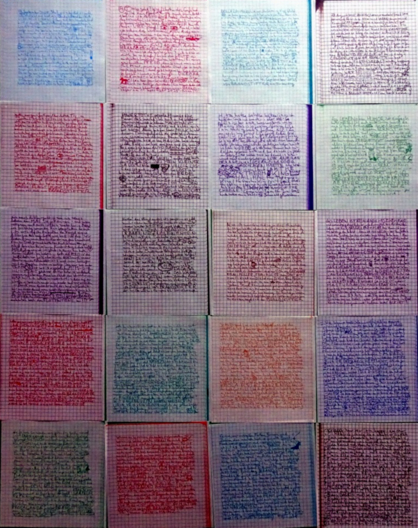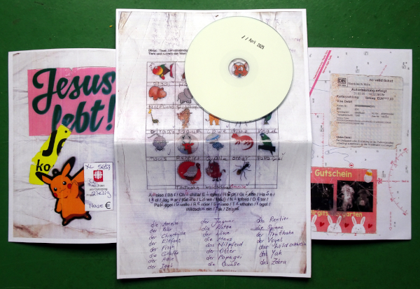 Hand assembled, burned, stamped and xeroxed edition with impromtu lyrics & music from weekly sound poetry sessions on Audio CDr, various mono print colours. 10,- € each (+ postage), all 6 in a batch: 54,- €
