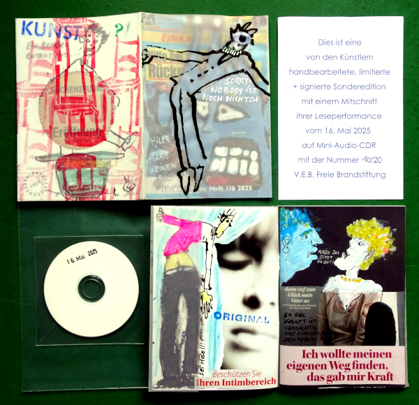 Special edition of the artzine Fliegen lieber unerkannt durchs Chaos, featuring an unique handmade cover drawing on transparent paper by Bernd Schneider, collaged with an googly eye by Brandstifter and other individual extra collaging and colouring, 48 pages A6, handstamped, numbered and signed edition of only 20 copies, with a reading performance by Schneider & Brandstifter at the vernissage Nobody ist überall May 16 2025 at Schaustelle BBK Wiesbaden, mouth harp, noise and on site fieldrecodings by Brandstifter on handstamped MiniCDr